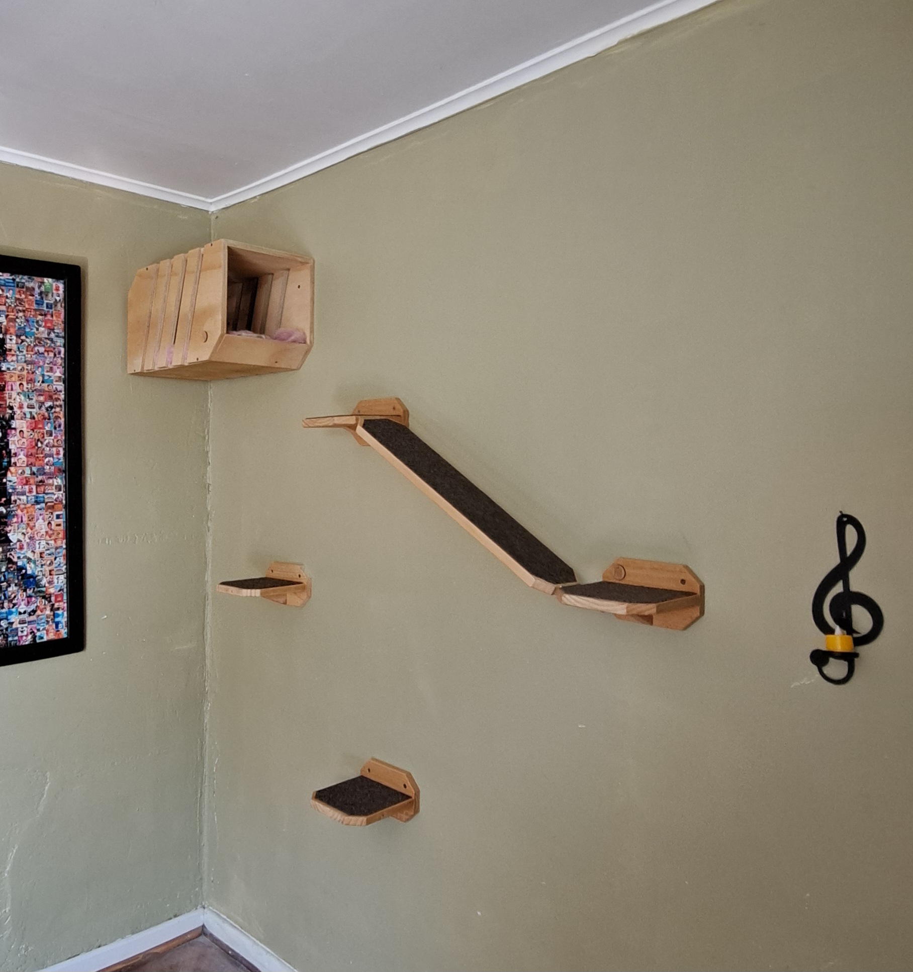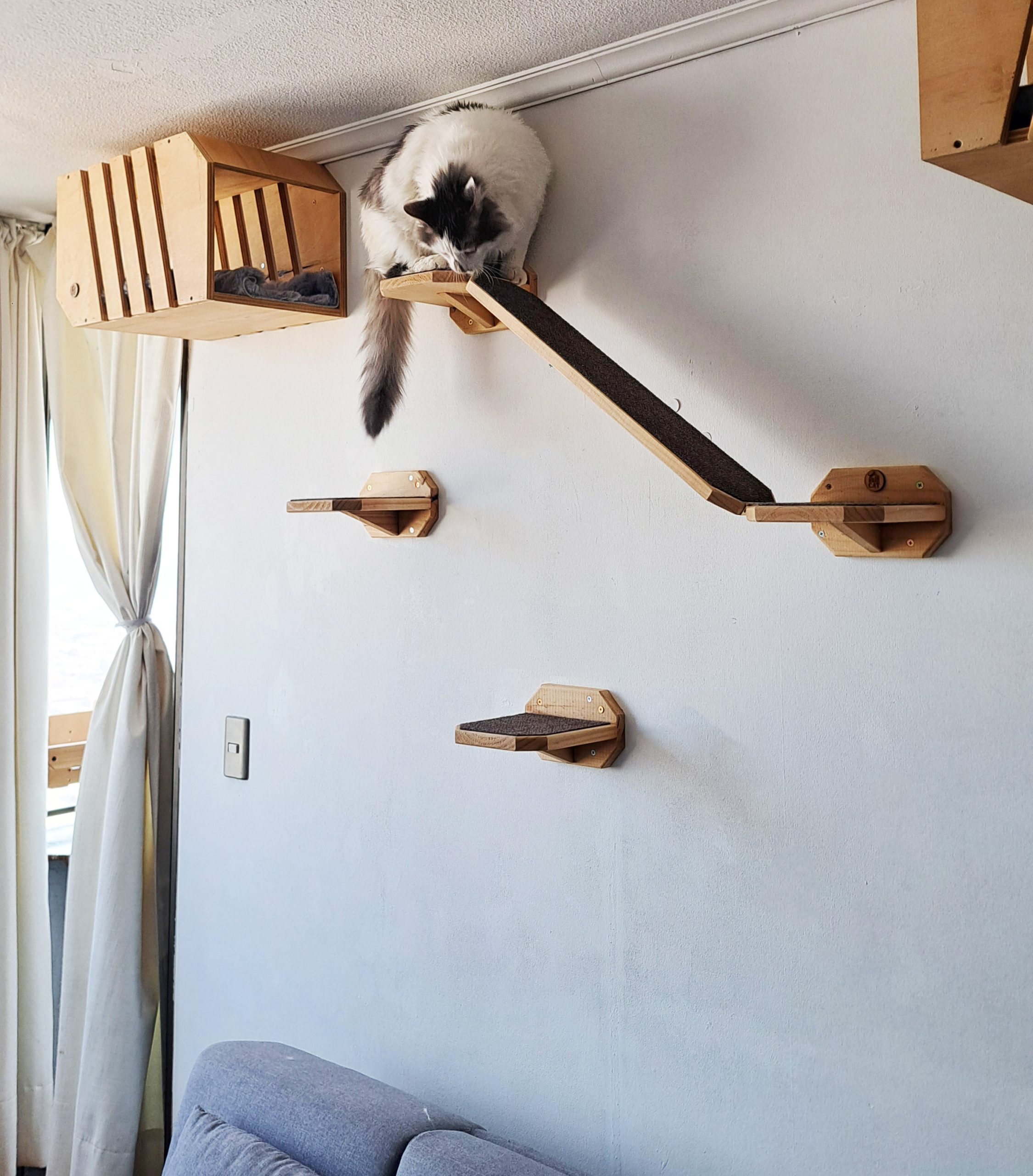 La disposición inclinada de la rampa y la organización estratégica de las repisas guían la mirada hacia la casita, creando un punto focal interesante y un recorrido estimulante para tu compañero aventurero. ¡Diseña un santuario vertical a medida para tu minino!