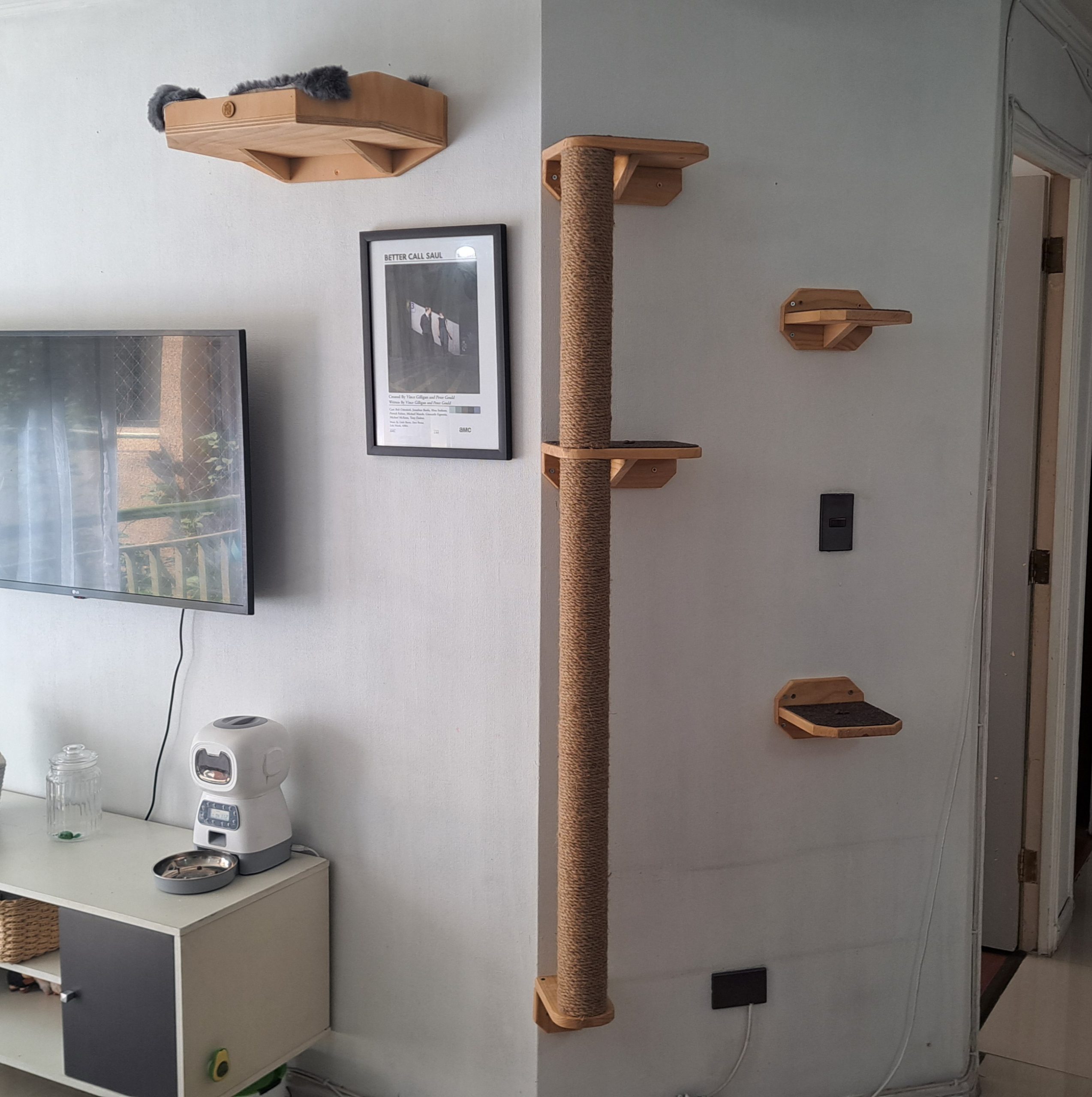 Es la solución vertical para muros angostos y altos, como balcones, transformando espacios limitados en un completo centro de actividades para tu gato. Este conjunto proporciona a tu felino un lugar elevado para dormir y relajarse, peldaños estratégicos para escalar y explorar, y un rascador robusto para trepar y mantener sus uñas saludables. Puedes elegir el tamaño de tu Rascador trepador.